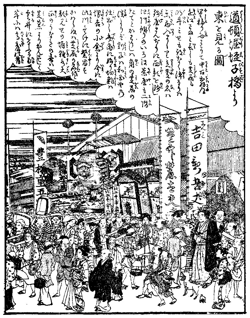 浄瑠璃繁昌 四ツ海しつかにして、日の恵ミもひとしほおしてる難波の繁栄、わけて道頓堀にハ歌舞妓操の六ツ矢倉打つゞく。中にも、竹本、豊竹の両芝居ははやる程に/\表口にハひいきの幟所をせき、木戸