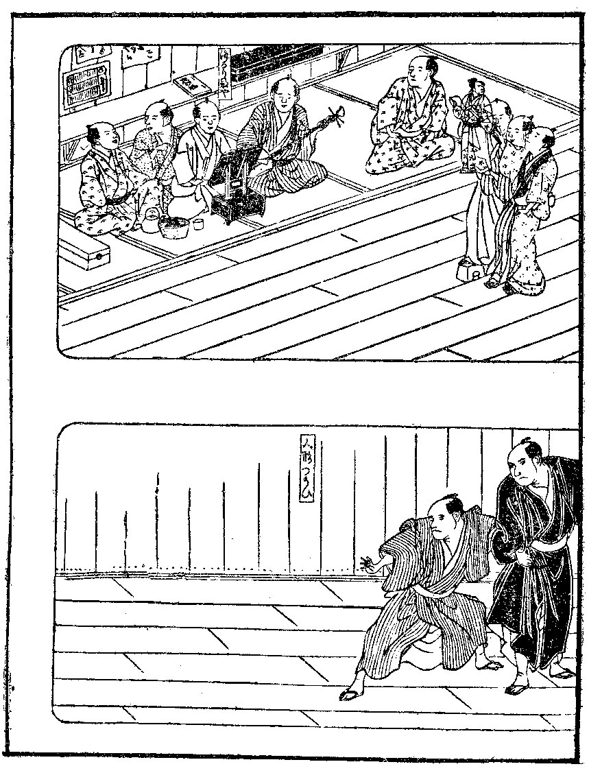 なをる。かたはらに太夫・役者、はるかこなたに表方と座をたゞし居こと皆図のことし。大歌舞妓のことハ、初篇に委敷(くハしく)出す。
