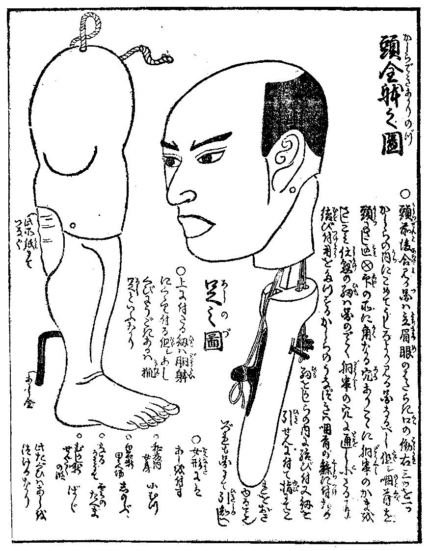 | [198] 頭(かしら)前後(ぜんごをあはせて)合内見圖(うちをみるづ) 引栓(ひきせん) 咽首(のどくび) 釣片(つりかた) ○ 片にして胴の内つける。○ 黒き所ハ鯨にて作る也。からうすト云。 此所をかまと云。 胴串(どうぐし) 小さな鯨にて作る。 [199] 頭(かしら)全躰(できあがり)之圖 ○ 頭前後合見(あはせみ)る図ハ立眉(たちまゆ)、眼のはたらき、口の働(はたらき)、右三ツを一ツのかしらの内にこめて、うしろより見る図なるべし。但シ咽首(のどくび)を頭にさし込、○印の所に角なる穴あり、こゝに胴串のかまをさしこミ、仕懸の紐ハ図のごとく、胴串の穴に通し小(こ)さるに結び付、用をたつする。かしらのうなづきハ、咽首の鯨に付たる紐をかしらの内に結び付、又紐を引せんに付て、指にてこれをおさゆること也。いづれも図にて引知べし。 足之図 ○ 上に付たる紐ハ胴躰にくゝり付る。但し、あしくびにうごきあるハ狐足といふなり。 此所紙にてつなぐ。 あし金。 ○ 女形にはあしを付ず。 ○ 和藤内女房 小むつ ○ 白石噺田うへ場 しのぶ ○ なるかみにて 雲のたへま ○ むかし噺 せんたくの段 ばゞ 此たぐひハあしをつけるなり。 | |