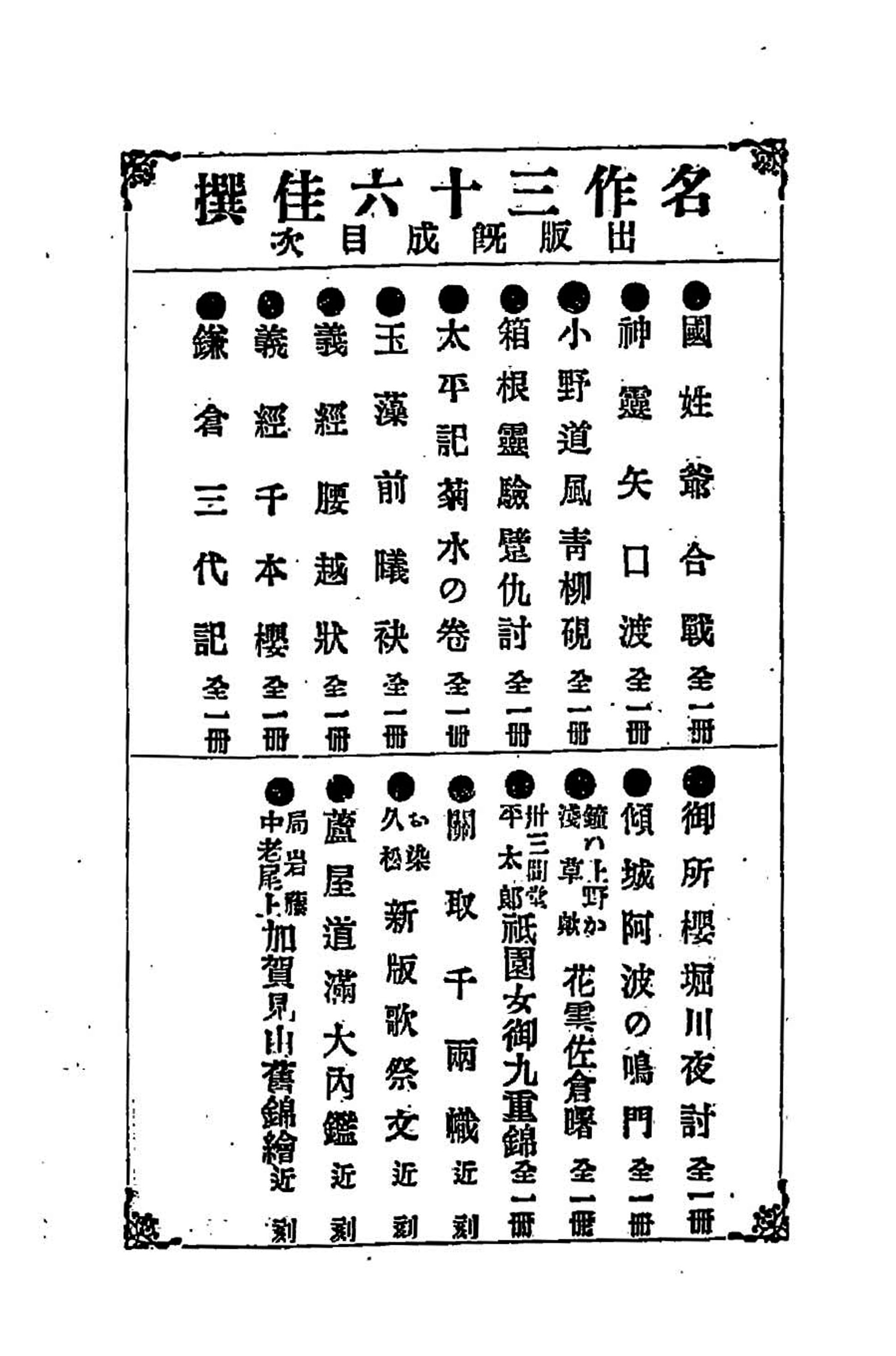 名作三十六佳撰の裏表紙広告(A-K)、完成広告(V-Z)の一覧である。