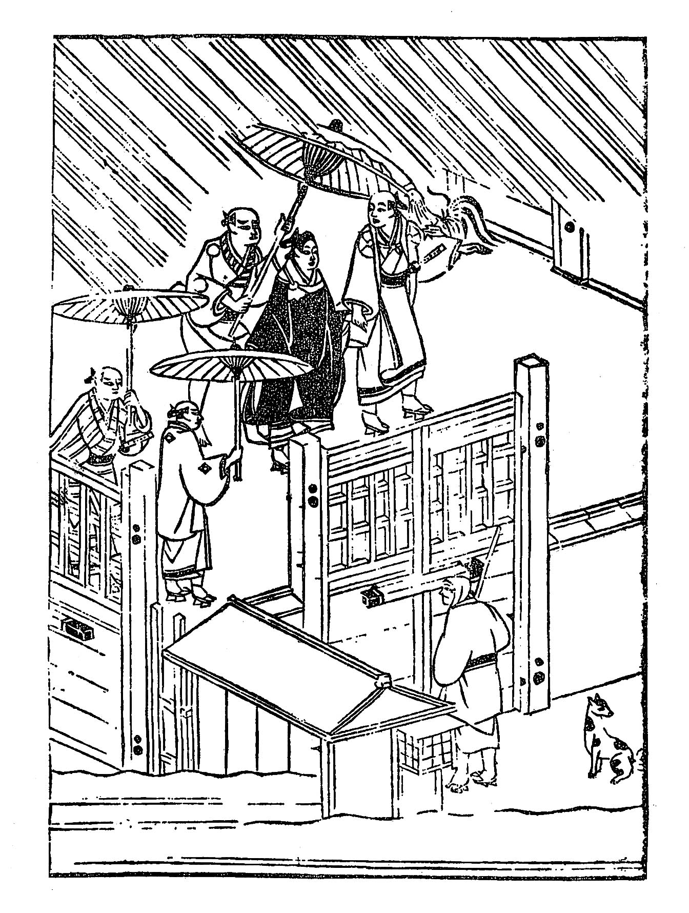 或書ニ云 松風村雨は北朝廃帝のとき行衡といふもの主上の御怒を得て海辺へ流され四年配所に住居せしが古郷の便りも間遠く諸ものうかりけれは配所の庵の傍に松樹を植て朝夕にこれを見て慰みけるが磯山あらし烈しく吹て折ふしは嵐の面白き声を聞一入懶き便りの友となしまた秋の夕は一村雨の折々音信て淋しき心をとふらひしによつてあるとき朝の松風夕の村雨を文会に書