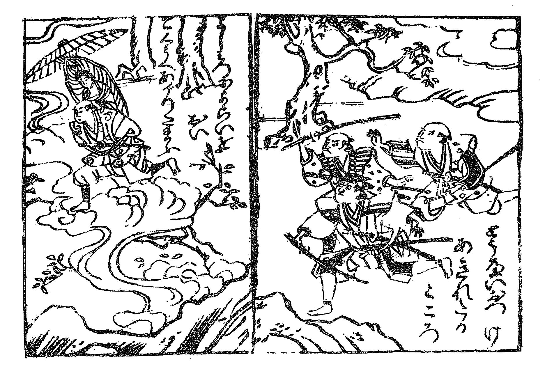 源太梅の花のさかりなるを一枝折て箙にさして敵の中へはせ入てたゝかふ時も引時も梅は風に吹れてさつと散ければ敵も味方もこれを見て感じける所に城の内より本三位中将殿の御使にて候梅をさゝせ給ひて候に申せと候