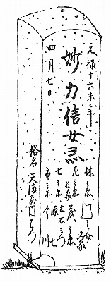 門左衛門事蹟(おこない)妙作の事ハ諸書に挙たれはこゝに略ス委ハ本書を見給へかし則摂州河辺郡久々知村 [かんざきより十八丁北] 広済寺に葬る [妙見宮寺内也] 石碑あり [自然の青小石也] 法名に曰