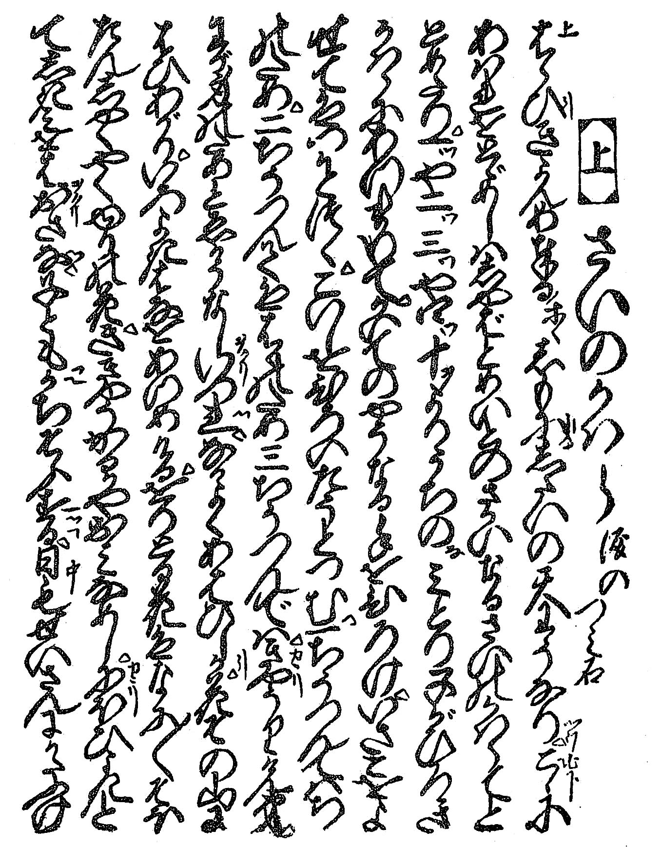 〽渚にのこる水鳥と声くらべて商はさながら京のすあひらしめせ〳〵めされや手のごい腰帯旅ゆがけ針や白粉揚枝さしに寒紅粉かうがい針さしはさみ毛ぬきに櫛手箱御影堂や祐仙が直筆扇奈良団かるたこきりこびんさゝら独り笑ひのでつこのぼうわかい子達のお手の道具きはやみかけ香やたきもの小田原うゐらう墨筆雁金の文七や曽根崎のお初が心中絵ざうし空直ござせぬサア〳〵めせ〳〵買んせぬかと売声はきやしやではすはでしやんとして云々