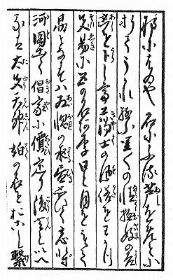 新町橋より東順慶町筋心齋橋まで三町が間商売人のともし火夜景すてがたき所地盛売のそば打出しの麺るいことに焼まんちうは所の名物天目酒にとうふの田楽うなぎのかばやきはお定り紋付の焼もちさもしけれど食物ことかゝず刻みたばこの新田屋今様の煙草入の商売数多浮世扇屋ひん付見世小間銀替る銭しやうばい闇の夜の提ケ挑灯軒に声あるこあげかご四季折々の枝おり花夏は螢の集め売鈴むし松むし声あるむしの商ひ浄瑠璃本の常見世に草紙物屋好色本辻打の上るり語り辻山伏の手の筋見疝気ぐすり嫁入紙養父にも功の薬うり時花哥の読売役者物まね太平記よみ手がひしやみせんの世渡り其他異形異類の商売珍しき小間物道具花を錺る商ひ此処より売初めざるはなし酉の刻より亥の下刻まで商売人市を飾り往来人引もちぎらず四季諸共に立込はさながら法会のごとく也夜るの風景不見しられずくはしくは走廻のおり御らんとのこしまいらせ候