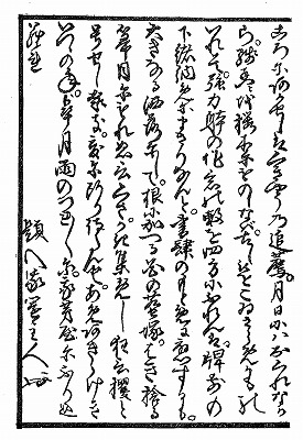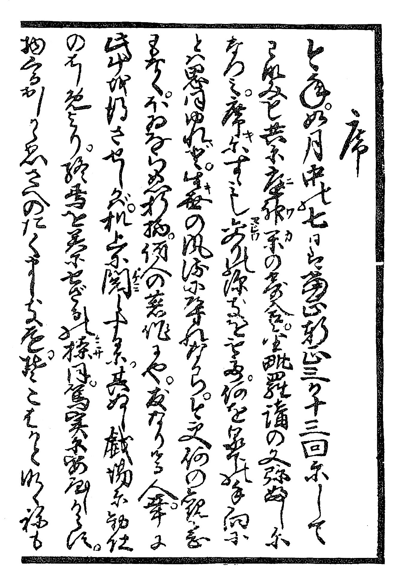▲抑門左衛門近松と称するハ叔家(はゝかた)の氏ニして浪士(らうにん)の砌より是を名乗る叔家の子孫芸州沼田郡府中村近松龍左衛門とて今なを連綿として代々村正を勤む予ハ又門左衛門の家より出シ女の子孫ニ而則又叔家の跡を続て近年(ちかごろ)近松ヲ以て氏とす不侫(およはす)なから門左衛門より遺志を続て則浄瑠理を筆作し東山ニ閑居して世を楽しむ当文政六癸未年すでに百廻に正当なるがゆへに此略記を著して菓林翁が誉名を弥増に薫さんがため拙き毫をこゝに止む