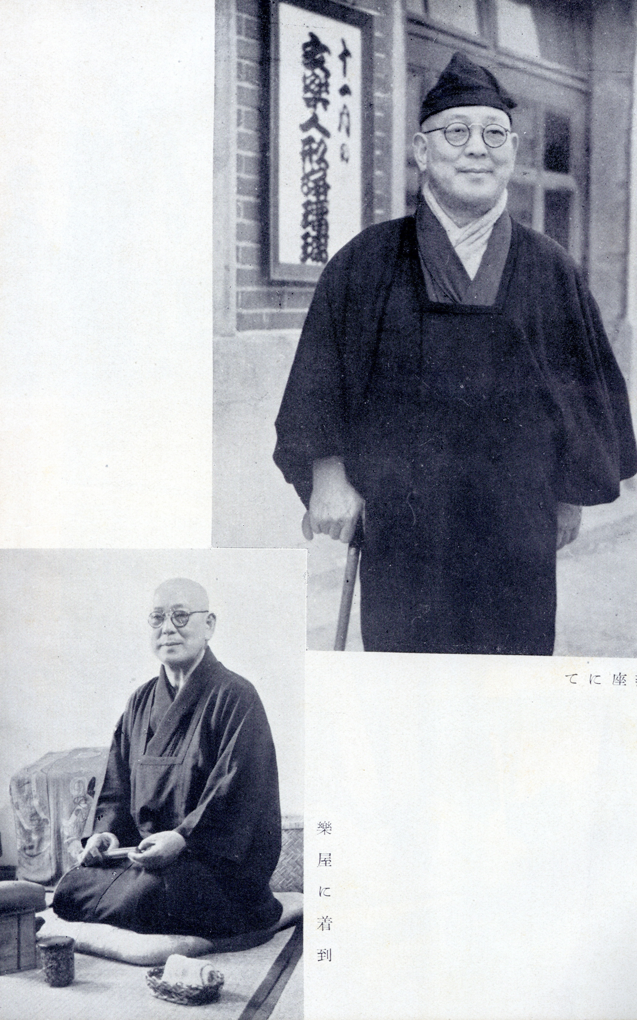 師の矍鑠振りをいふと、文楽座開演中は毎日、京都市電、京都大阪間の省線、大阪駅からまた地下鉄、これだけの行程を供も連れず単身往復して出勤してゐる。利久帽子に裾短かの道行合羽、雨の日は、たつつけを穿いてゴム長に足を固めてゐる。さうした扮装[いでたち]で、胸を張つてステッキか洋傘を突いてゐる師に、行摺りに出遇ふ誰が師を古稀を越へた翁と思ふであらう。この春だつたか、文楽座出勤の帰途京都駅で、眼先の利かぬ若い警官に闇屋と間違へられて、合財入れで膨れた懐中を著物の上から探られたといふ珍聞もある。ゴム長が崇つたのであらう。