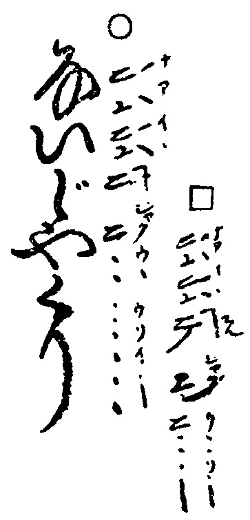 〽かアちイはアだ、アヽヽヽしイヽ、イヽヽ、イヽ、イヽ、イヽイ、イヽイヽ、(ヤ)トントン、イヽ--